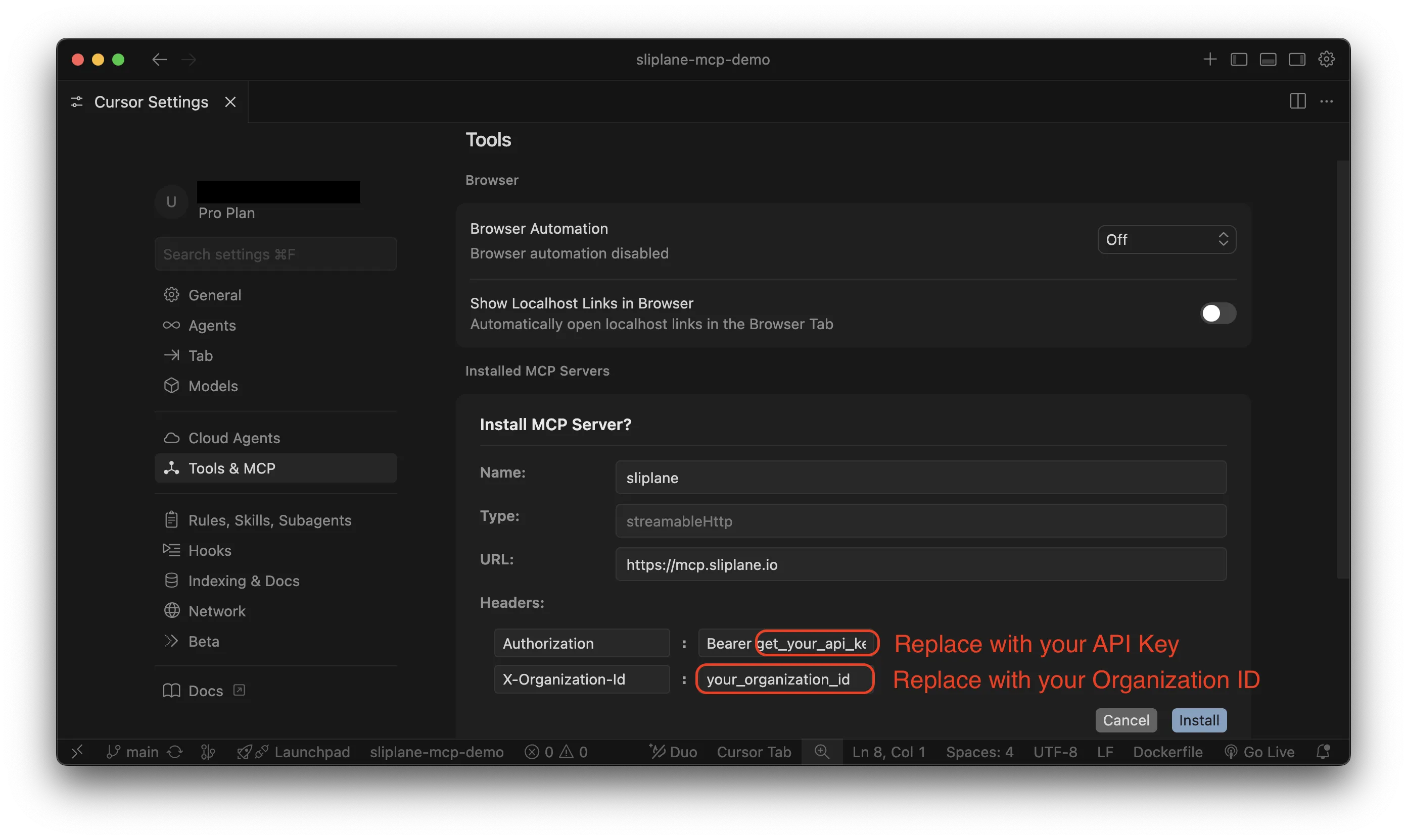 Cursor will open the install flow and open the configuration page for you. All you need to do is to paste your API key.